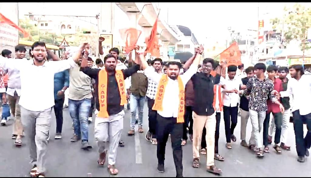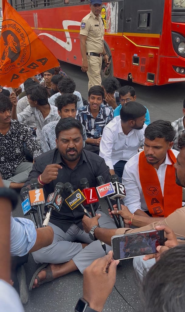 కూకట్పల్లి, సూర్య న్యూస్ : అఖిల భారతీయ విద్యార్థి పరిషత్ (ఏబీవీపీ) తెలంగాణ రాష్ట్ర శాఖ పిలుపులో భాగంగా కూకట్పల్లి విభాగ్ ఆధ్వర్యంలో విద్యార్థులు భారీ ఎత్తున రాస్తారోకో నిర్వహించారు. విద్యారంగంలో నెలకొన్న సమస్యలను పరిష్కరించాలని డిమాండ్ చేస్తూ కార్యకర్తలు అర్ధనగ్న ప్రదర్శనతో నిరసన తెలిపారు. ఈ సందర్భంగా కూకట్పల్లి ప్రధాన రహదారిపై బైఠాయించడంతో ట్రాఫిక్ నిలిచిపోయింది.
