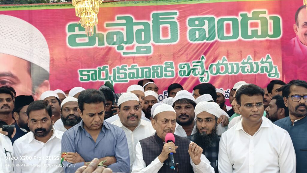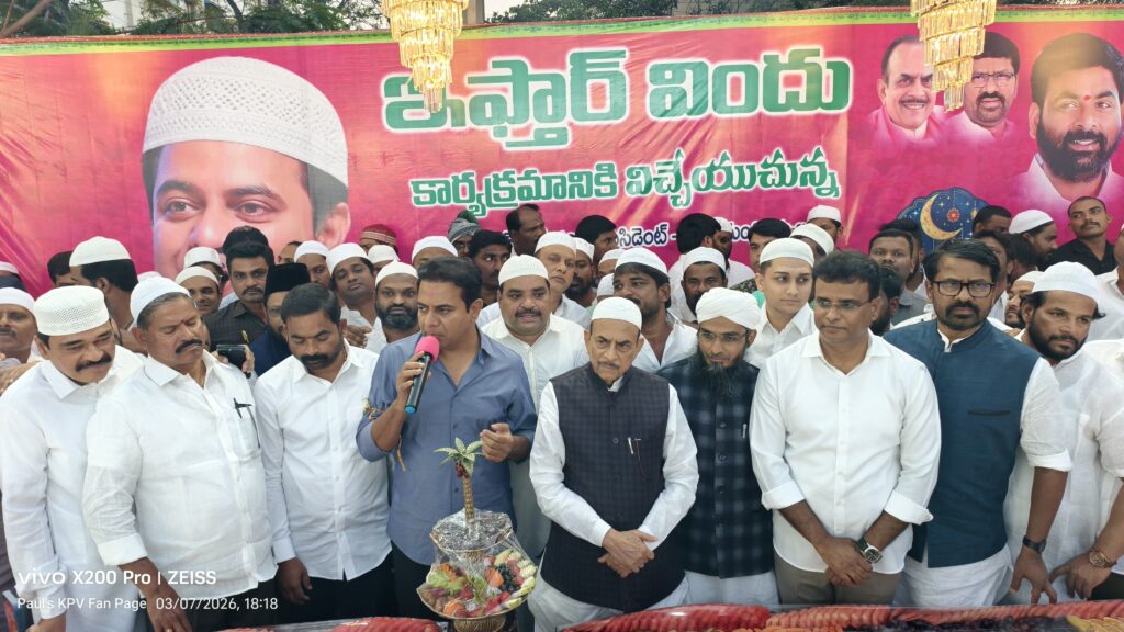 హైదరాబాద్: తెలంగాణ రాష్ట్రంలో అన్ని మతాల పండుగలకు సముచిత ప్రాధాన్యత కల్పించిన ఘనత బీఆర్ఎస్ ప్రభుత్వానిదేనని ఆ పార్టీ వర్కింగ్ ప్రెసిడెంట్ కేటీఆర్ స్పష్టం చేశారు. నేటి కాంగ్రెస్ ప్రభుత్వ హయాంలో పండుగలు తమ ఉనికిని కోల్పోతున్నాయని, కనీసం బడ్జెట్ కేటాయింపులు కూడా లేకపోవడం శోచనీయమని ఆయన విమర్శించారు. శనివారం సూరారం డివిజన్ టీఎస్ఐఐసీ మల్టీ పర్పస్ ఫంక్షన్ హాల్లో ఎమ్మెల్యే కేపీ వివేకానంద్ ఆధ్వర్యంలో నిర్వహించిన ఇఫ్తార్ విందులో కేటీఆర్ ముఖ్య అతిథిగా పాల్గొన్నారు.