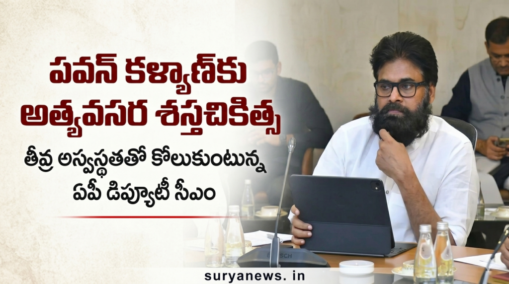 అమరావతి, సూర్య న్యూస్ : ఆంధ్రప్రదేశ్ (Andhra Pradesh) ఉప ముఖ్యమంత్రి (Deputy CM), జనసేనాని పవన్ కళ్యాణ్ అస్వస్థతకు గురి కావడంతో శనివారం సాయంత్రం ఒక ప్రైవేట్ ఆసుపత్రిలో అత్యవసర సర్జరీ (Emergency Surgery) నిర్వహించారు. కొంతకాలంగా ఆయన శారీరక శ్రమ మరియు పని ఒత్తిడితో సతమతమవుతున్నారు. శుక్రవారం అధికారులతో పాలనాపరమైన సమీక్ష (Review Meeting) నిర్వహిస్తుండగా ఆయన అకస్మాత్తుగా తీవ్ర అస్వస్థతకు గురయ్యారు. వెంటనే అప్రమత్తమైన సిబ్బంది ఆయనకు ప్రాథమిక వైద్య పరీక్షలు నిర్వహించారు. వైద్యుల సూచన మేరకు ఆయన అన్ని అధికారిక కార్యక్రమాలను రద్దు చేసుకుని చికిత్స కోసం ఆసుపత్రికి వెళ్లారు.