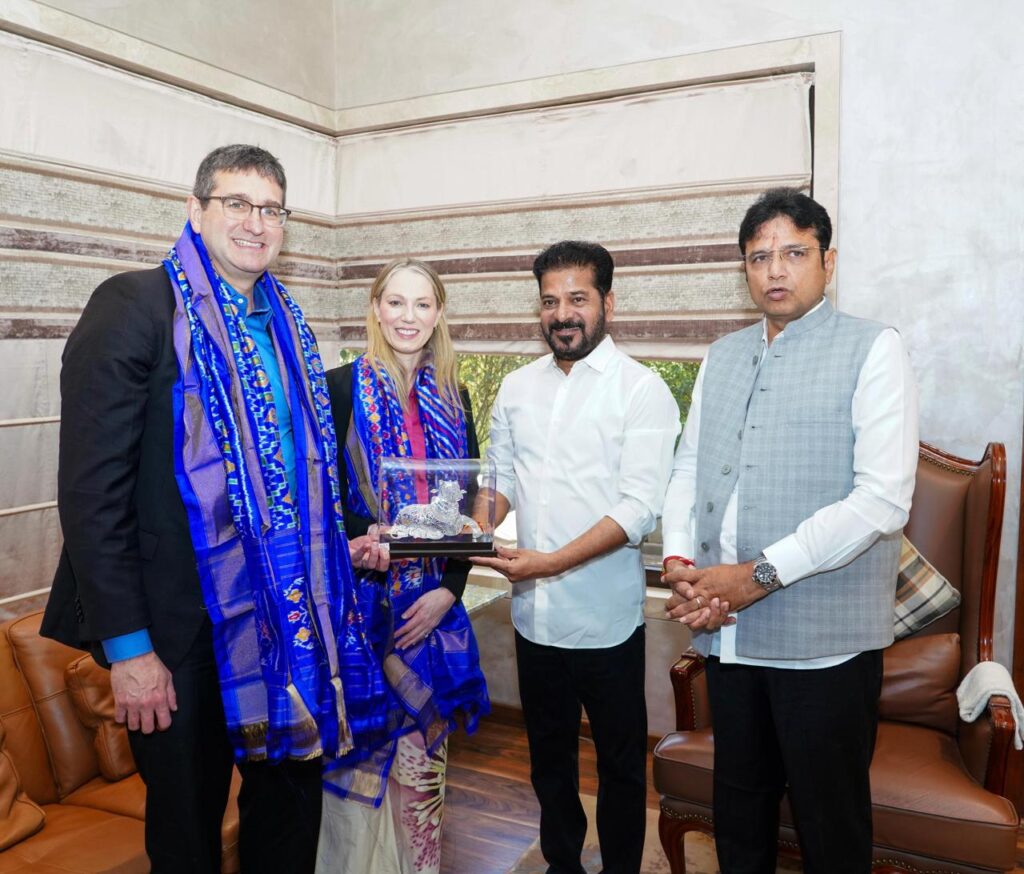 హైదరాబాద్: తెలంగాణ రాష్ట్ర ప్రగతి ప్రస్థానంలో అంతర్జాతీయ భాగస్వామ్యాలను బలోపేతం చేసే దిశగా మరో అడుగు పడింది. అమెరికాలోని డెలావేర్ గవర్నర్ మ్యాట్ మేయర్, ఫస్ట్ లేడీ లారెన్ మేయర్లతో కూడిన ప్రతినిధి బృందం ముఖ్యమంత్రితో భేటీ అయ్యింది. ఈ సమావేశంలో ఇరు రాష్ట్రాల మధ్య ఆరోగ్యం, విద్య, ఆర్థిక రంగాల్లో పరస్పర సహకారంపై సుదీర్ఘంగా చర్చించారు.