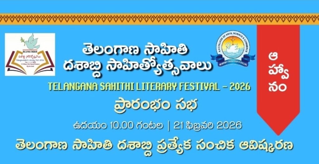 హైదరాబాద్, ఫిబ్రవరి 21, 2026: తెలంగాణ సాహితి సంస్థ ఏర్పడి 10 సంవత్సరాలు పూర్తి చేసుకున్న సందర్భంగా హైదరాబాద్లోని ఏ.వి. కళాశాలలో జరుగుతున్న తెలంగాణ సాహితి దశాబ్ది సాహిత్యోత్సవాలు (Telangana Sahithi Literary Fest – 2026)లో రాష్ట్ర గ్రంథాలయ పరిషత్ చైర్మన్ డా. రియాజ్ గౌరవ అతిథిగా పాల్గొన్నారు. ఈ ఉత్సవాలు ఫిబ్రవరి 21, 22 తేదీల్లో ఉదయం 10 గంటల నుంచి వైభవంగా జరుగుతున్నాయి.