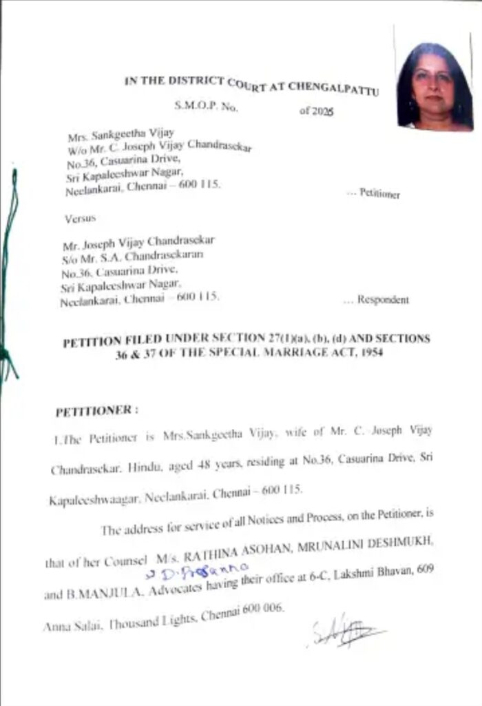 చెన్నై (సూర్య న్యూస్): తమిళ చిత్ర పరిశ్రమలో అగ్ర నటుడిగా, రాజకీయాల్లో ‘తమిళగ వెట్రి కళగం’ పార్టీతో దూసుకుపోతున్న దళపతి విజయ్ వ్యక్తిగత జీవితంపై తాజా పరిణామాలు సంచలనంగా మారాయి. గత 27 ఏళ్లుగా అన్యోన్యంగా ఉన్న విజయ్, సంగీత దంపతులు విడాకులు తీసుకోబోతున్నట్లు తెలుస్తోంది. విజయ్ భార్య సంగీత తమిళనాడులోని చెంగల్పట్టు కోర్టులో విడాకుల పిటిషన్ దాఖలు చేయడం ఇప్పుడు సినీ, రాజకీయ వర్గాల్లో చర్చనీయాంశమైంది.
